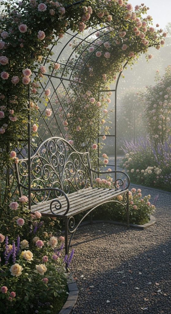 Wrought iron benches bring an old-world charm that feels straight out of a Victorian novel. Their intricate scrollwork catches the morning dew like lace.