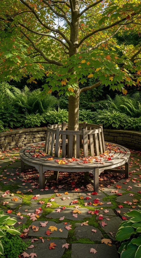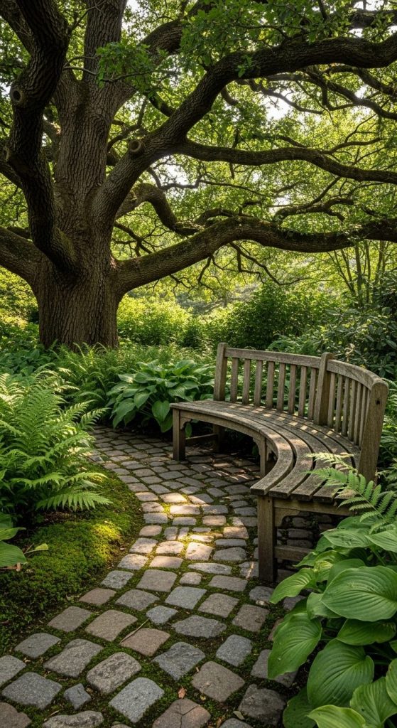 Few things feel as inviting as a curved teak bench under a sprawling oak — it’s like the garden itself is embracing you.