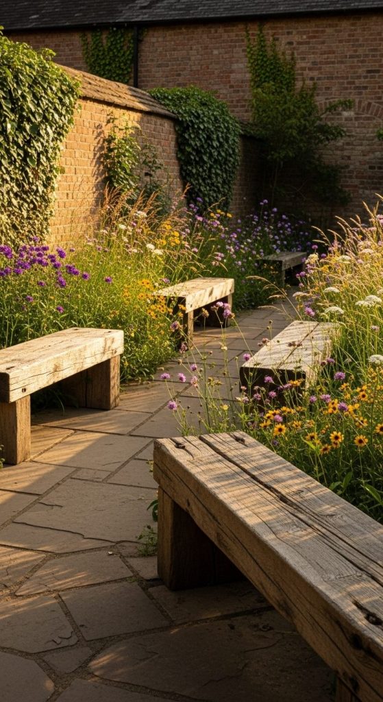 6. Reclaimed Timber Benches — Rustic, Sustainable Charm