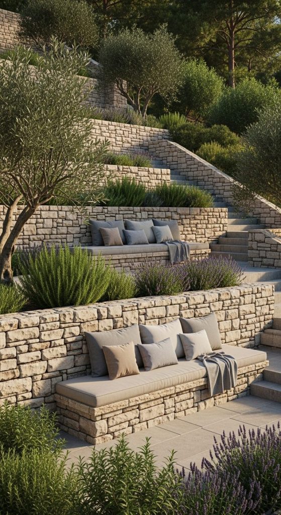 7. Built-In Stone Wall Benches — Seamless Integration