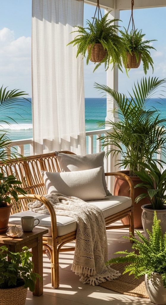 A wicker bench beneath palm fronds and soft drapes evokes eternal summer — the kind of effortless luxury that never tries too hard.