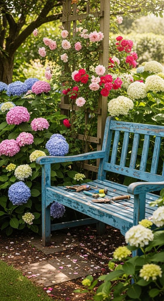 Who says benches must blend in? A bold color — emerald green, French blue, or coral red — can turn a quiet garden into an expressive canvas.