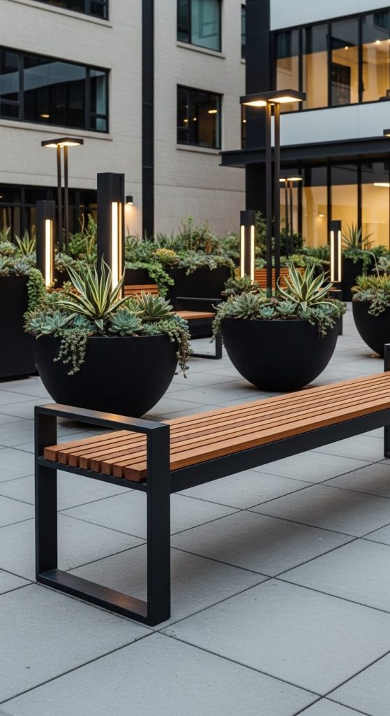 For a courtyard or rooftop garden, this look hits that “designer-industrial” sweet spot — smart, urban, and functional.