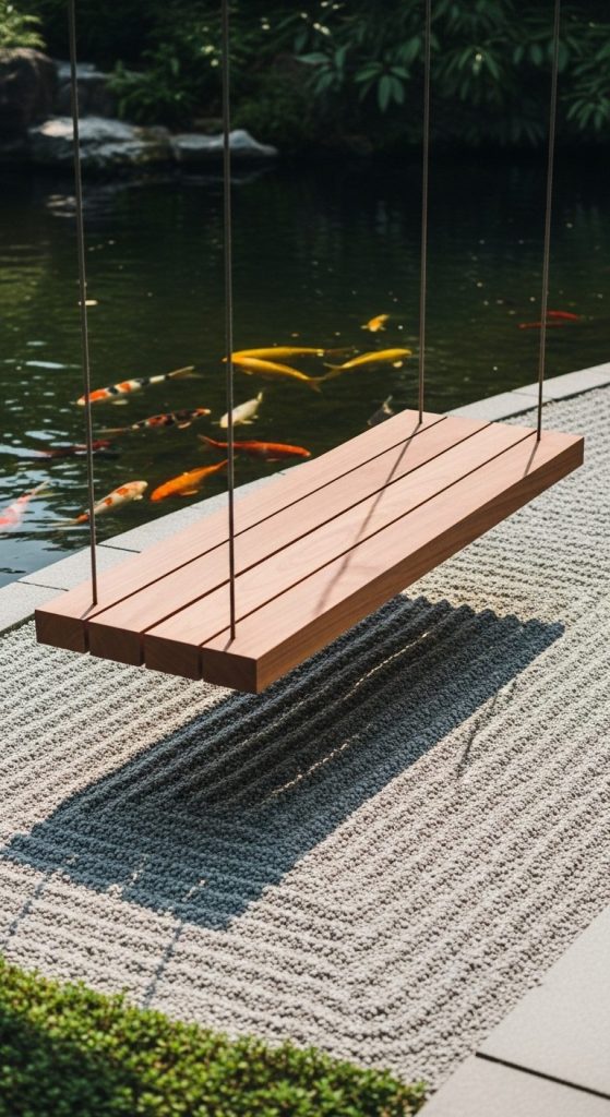 A floating bench, anchored subtly to walls or hidden bases, creates visual magic. It appears weightless amid foliage.
