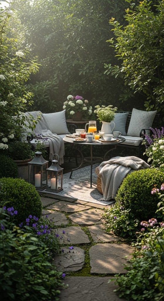 Turn corners of your garden into cozy seating areas with small tables, cushions, and lanterns. Perfect for intimate meals or solo garden meditation.