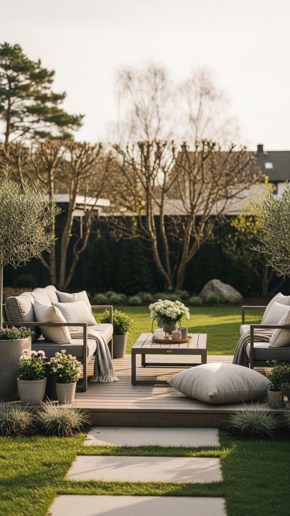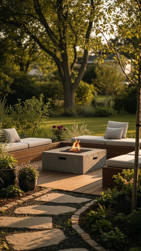 A low fire pit surrounded by comfy seating creates a cozy evening spot. It’s warm, inviting, and perfect for people who enjoy late-night conversations.