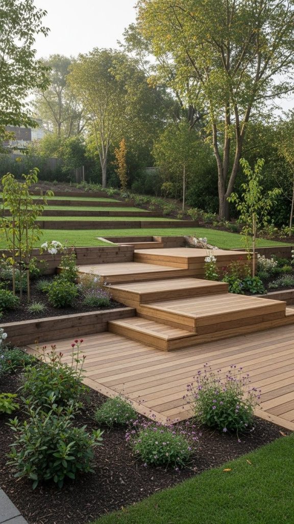 Uneven yards feel intentional and stylish with multi-level decking instead of a single flat surface.