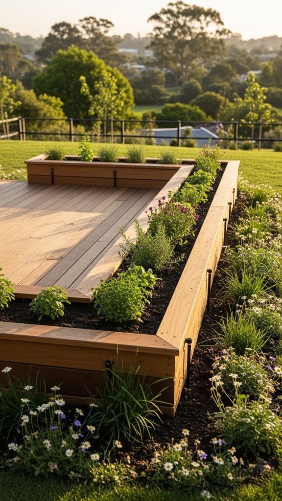 A low, platform-style deck that meets a garden bed feels effortless and natural. You step from warm wood straight into soft greenery. It’s ideal for anyone wanting a gentle, continuous landscape.