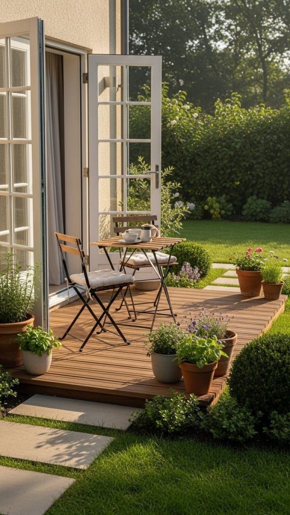 There’s something incredibly charming about a tiny deck right off the kitchen. Just enough space for a small table, two chairs, and your morning routine. It doesn’t try to be the “main event”—it’s simply a sweet spot for slow moments.