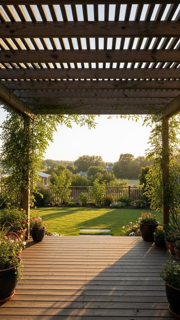 A pergola brings instant charm and structure to a deck. It frames the space, softens the sun, and just makes the area feel more intentional. Add climbing vines or string lights if you want extra warmth.