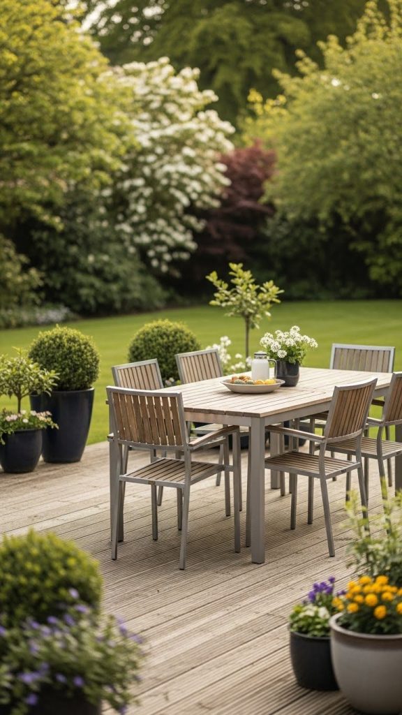 If you love hosting, a dedicated dining deck changes everything. You can set up a sturdy outdoor dining table, comfortable chairs, and even a portable grill nearby. Meals feel more relaxed outside.
