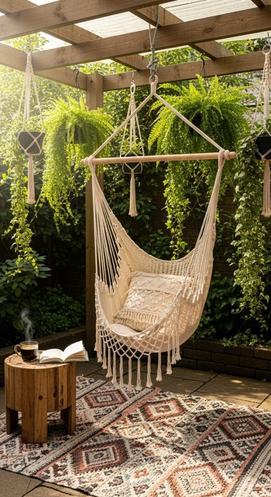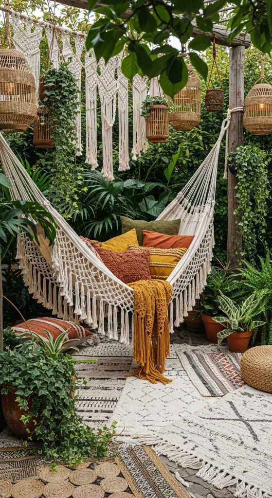 If your garden leans more artistic or cozy, a handwoven macramé hammock adds instant charm. The soft cotton ropes and fringe details create that dreamy, laid-back boho aesthetic.