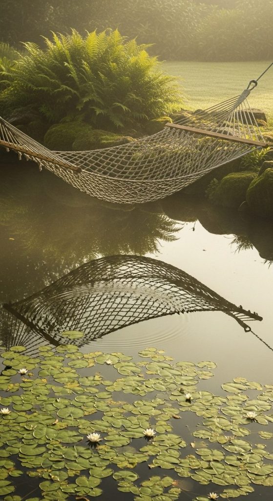 Now we’re getting fancy. Hanging a rope hammock near or partially over a reflective pond creates an almost meditative effect. The sound of water, the reflections — pure serenity.