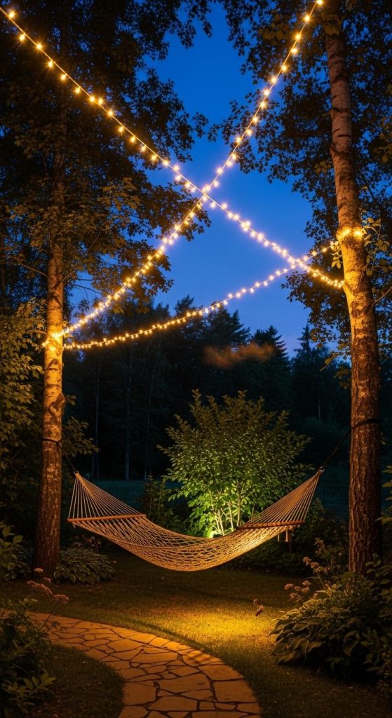 This one’s pure magic. Hanging fairy lights above your hammock instantly transforms your garden into a nighttime wonderland.