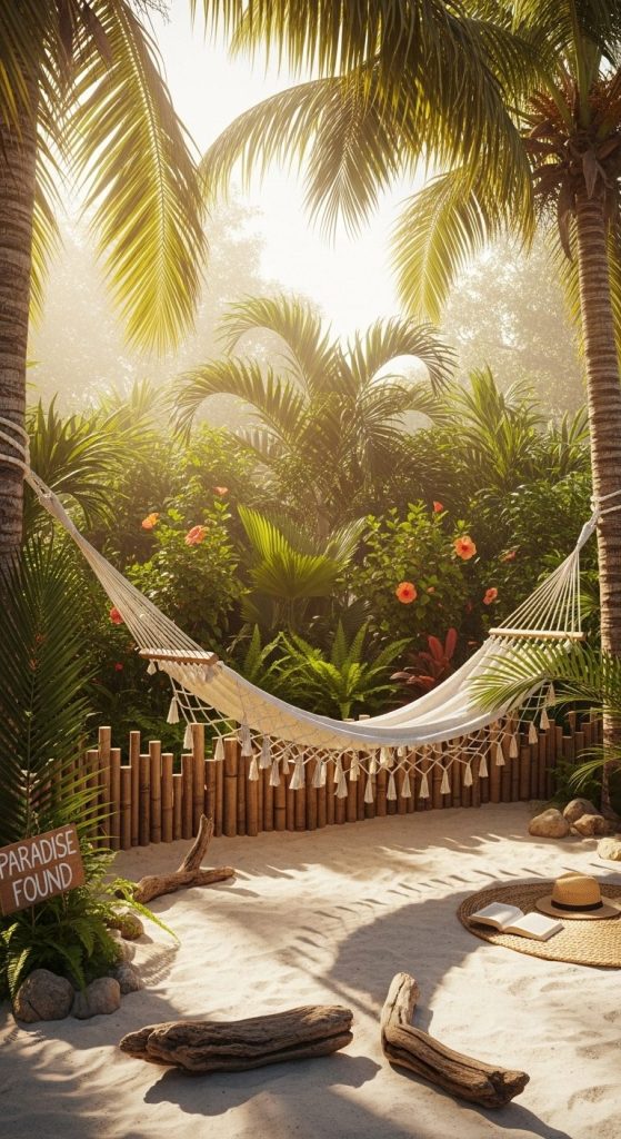 A tropical hammock corner turns your garden into paradise — a permanent “out of office” zone.
