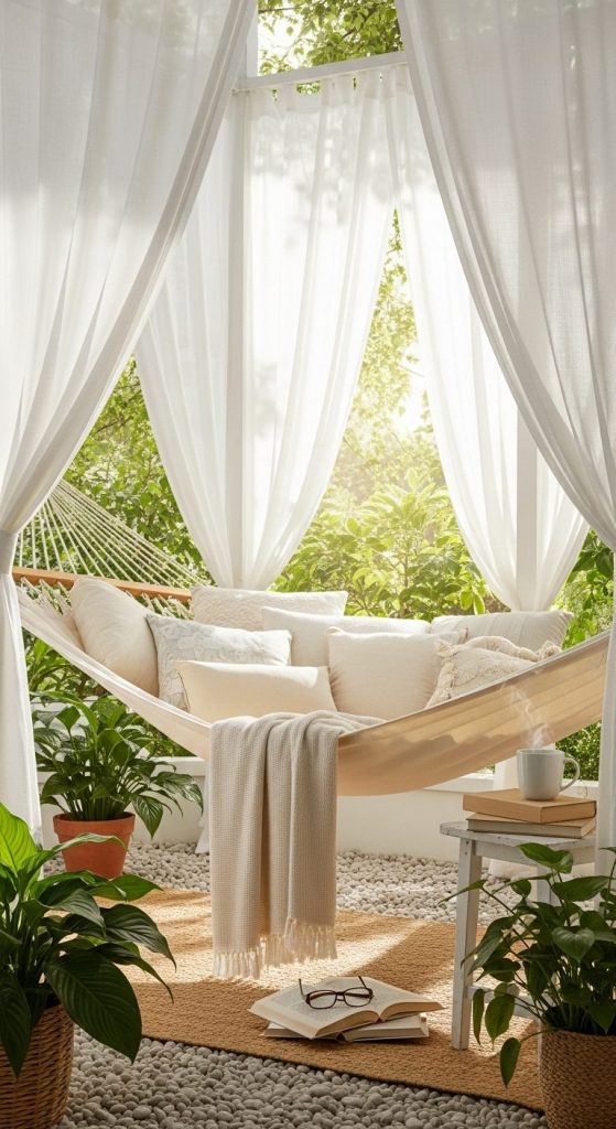 A curtained hammock nook blends comfort and seclusion — your peaceful escape from the world, just steps from your door.