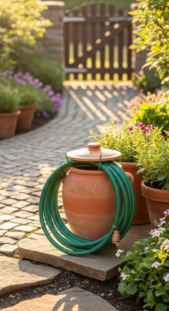 A large clay or ceramic pot can double as a hose storage solution. I picked a terracotta one that blends with my garden’s rustic vibe. Simply coil the hose inside and cover with the lid or leave slightly open for a casual, lived-in look.