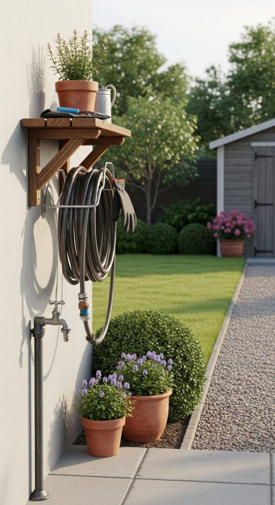 Some wall-mounted hangers come with an attached shelf. I added one above my backdoor, perfect for coiling the hose while keeping garden gloves, spray nozzles, or plant food handy.