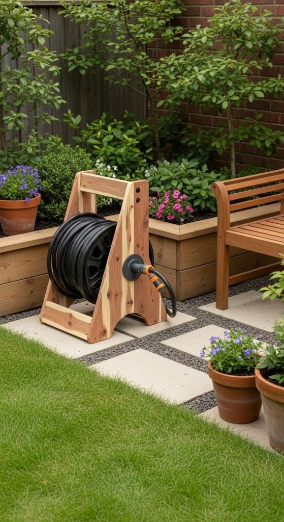 If you love a natural, farmhouse aesthetic, a wooden hose holder is simple and timeless. I made mine from cedar planks—it resists rot and adds warmth to my backyard.