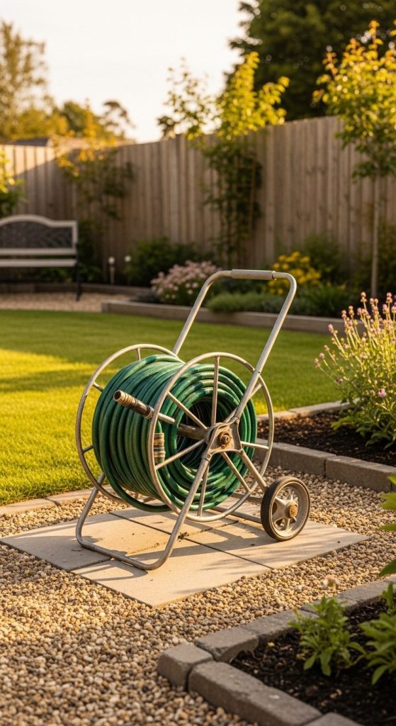 For a quirky, nostalgic touch, a vintage wheel hose reel works beautifully. I found one at a second-hand store—it’s sturdy, rolls smoothly, and feels like a little piece of garden history.