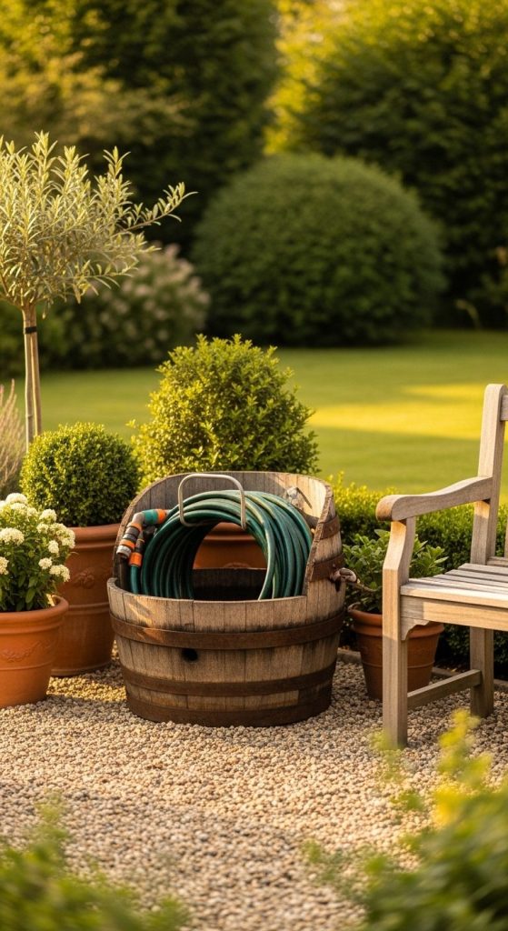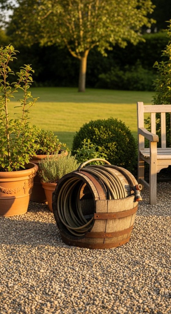Upcycling a small wooden barrel gives a rustic vibe while keeping the hose concealed. I painted mine and lined the interior with waterproof material—it’s functional and decorative.