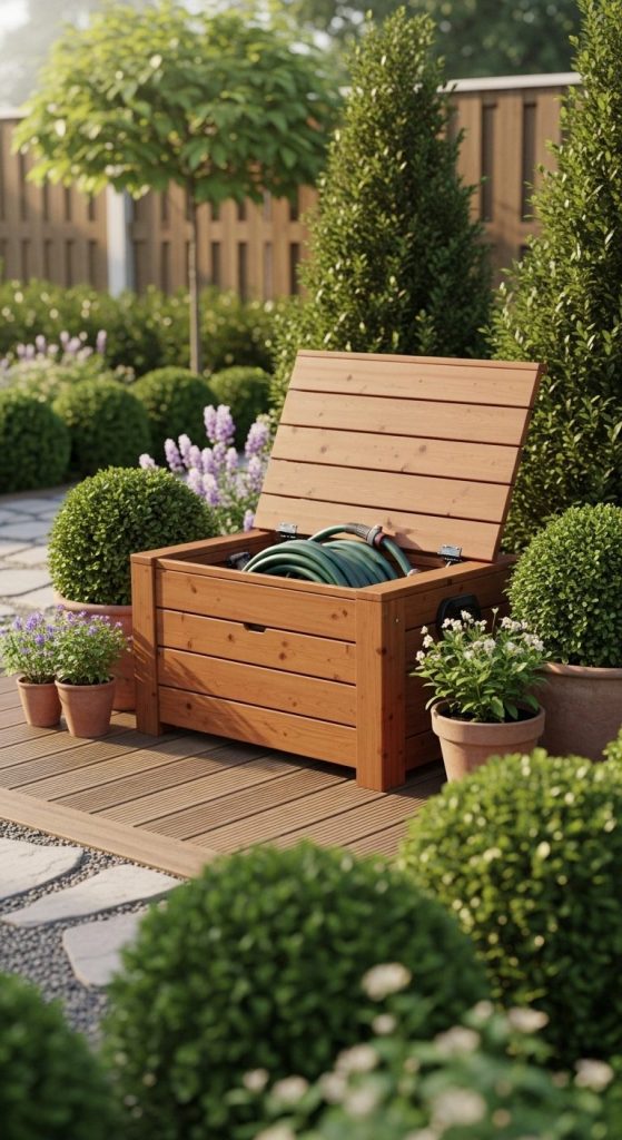 A garden bench that doubles as hose storage? Genius. Mine has a hinged top where the hose coils away, and it doubles as extra seating when friends visit.
