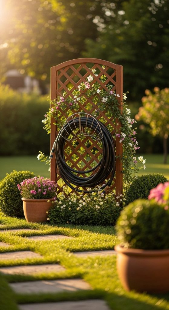 A lattice panel doubles as a holder and subtle privacy screen. My hose coils behind the lattice, which also supports climbing plants, softening its presence.