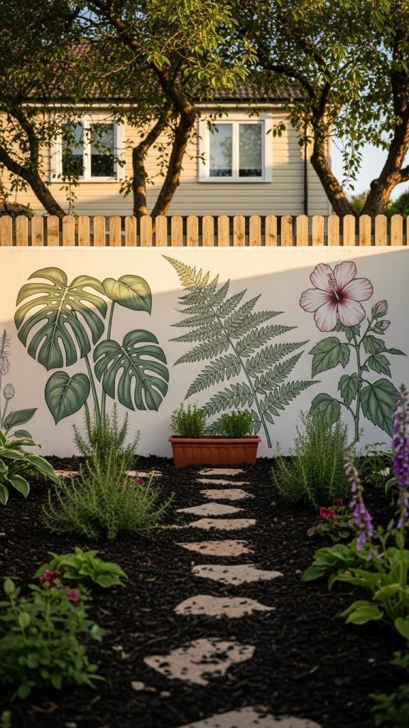 Imagine walking past a wall covered in oversized sketches of ferns, hibiscus, or monstera leaves. Botanical murals are timeless and easy to adapt to any garden style.