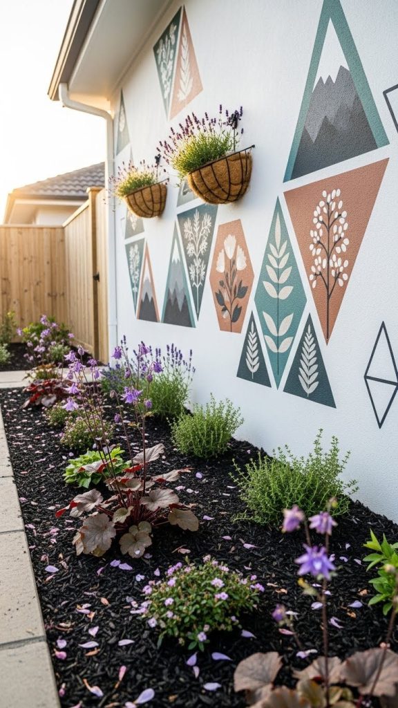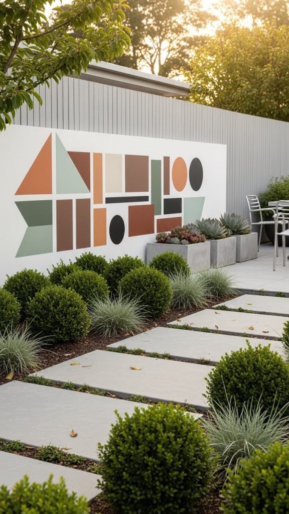 Bold geometric shapes in muted or earthy tones can add a modern flair to a simple garden wall. It’s contemporary art meets outdoor decor.