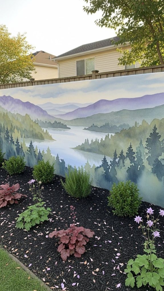 Soft, flowing watercolor murals can mimic mountains, lakes, or rolling hills. They add depth and serenity to your outdoor area.