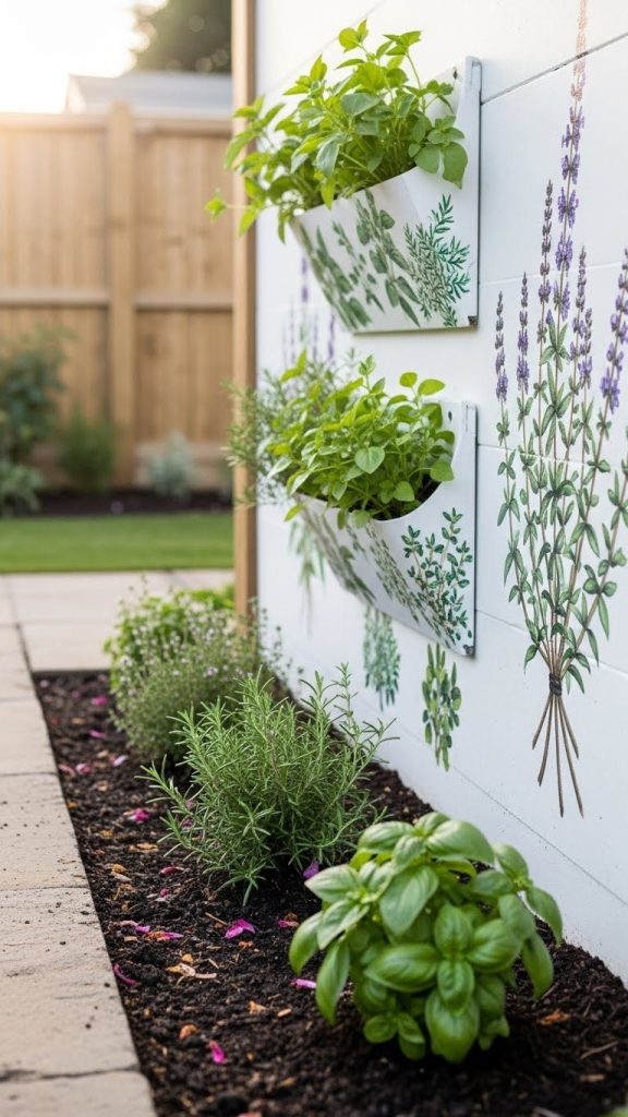 Combine a mural of herbs like rosemary, thyme, or basil with real, vertical garden plantings. Functional and decorative in one.