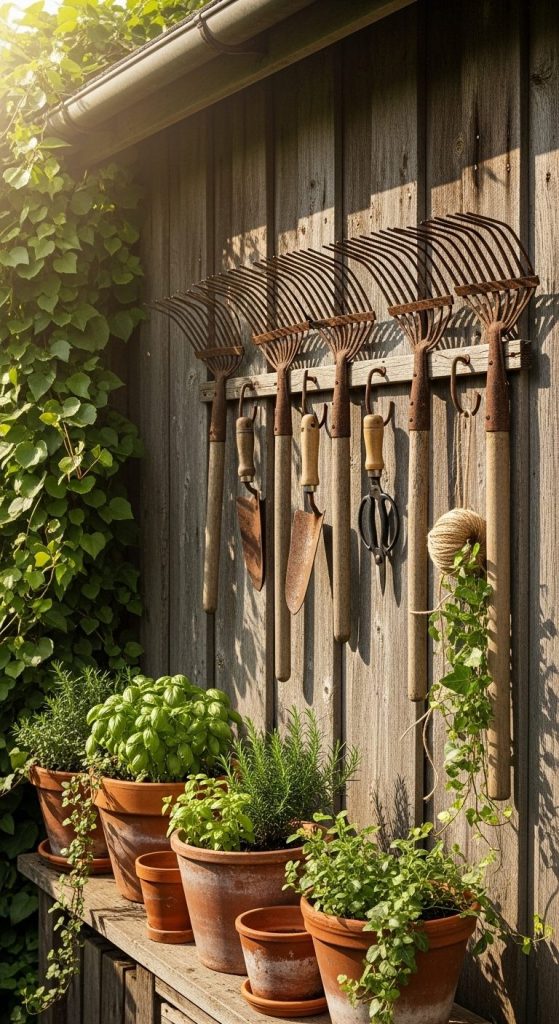 If you’ve ever seen those Pinterest-style garden sheds with cute hanging tools, this is the secret. Old metal rake heads make perfect rustic hooks once you remove the handle and mount them on a wall.