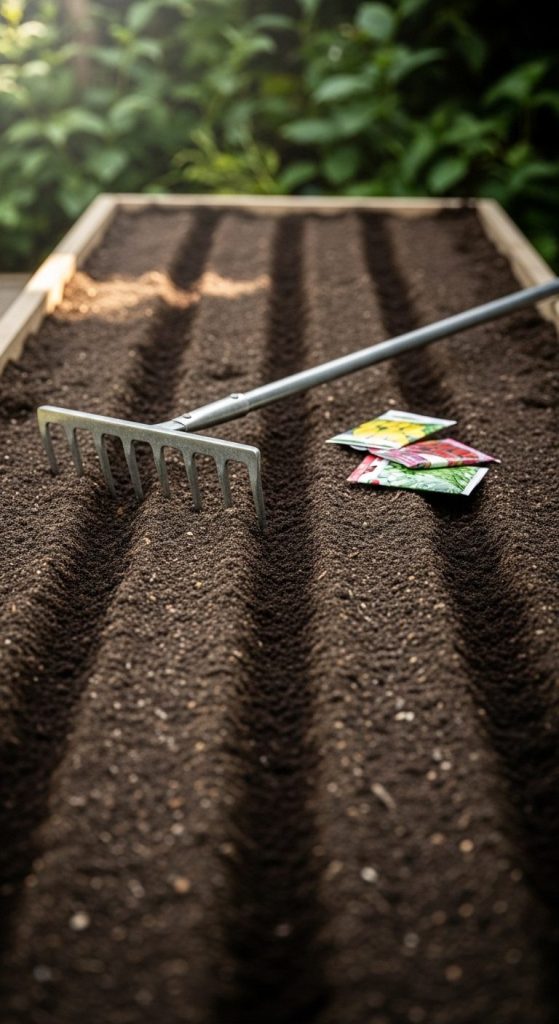 8. Using a Rake to Create Garden Furrows for Seed Planting