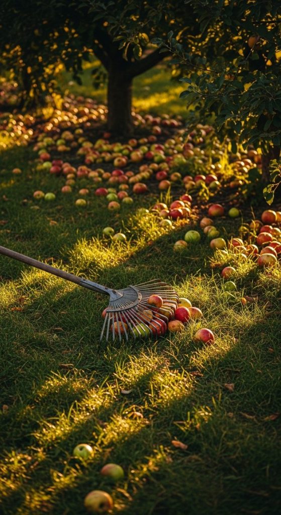 A rake keeps fruit trees tidy — and your shoes much safer.