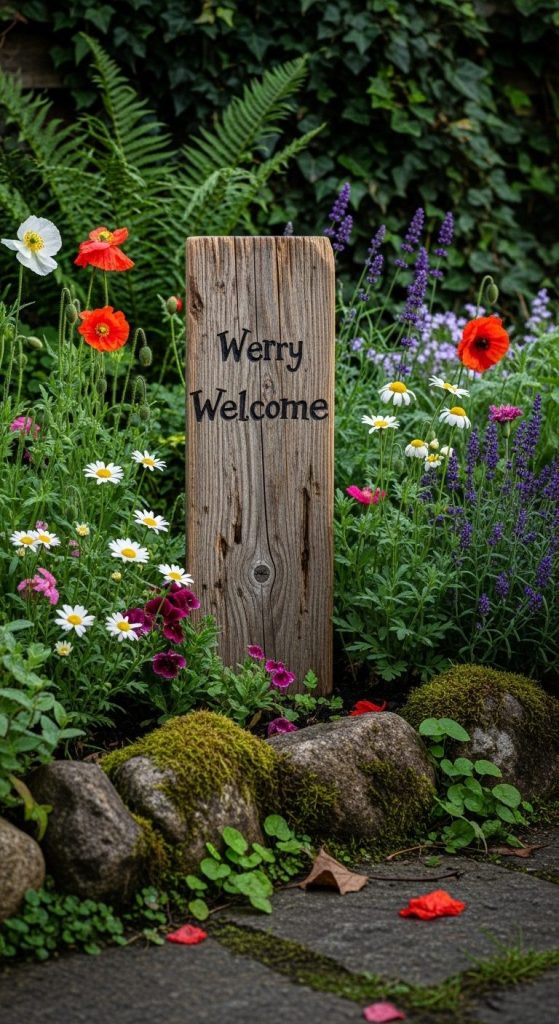I love this one personally—using reclaimed wood not only recycles materials but adds character and history to your garden. Every dent, nail hole, and faded patch tells a story. Paint, carve, or stencil a welcome message, and your garden instantly feels curated yet natural.