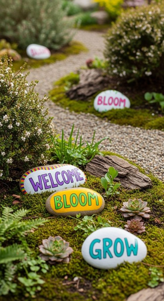 If you want a low-maintenance, quirky option, painted rocks are a fun alternative. Write plant names, motivational quotes, or directions on medium-sized stones placed strategically around your garden paths.