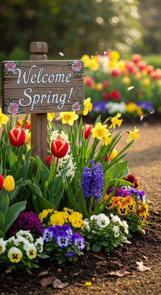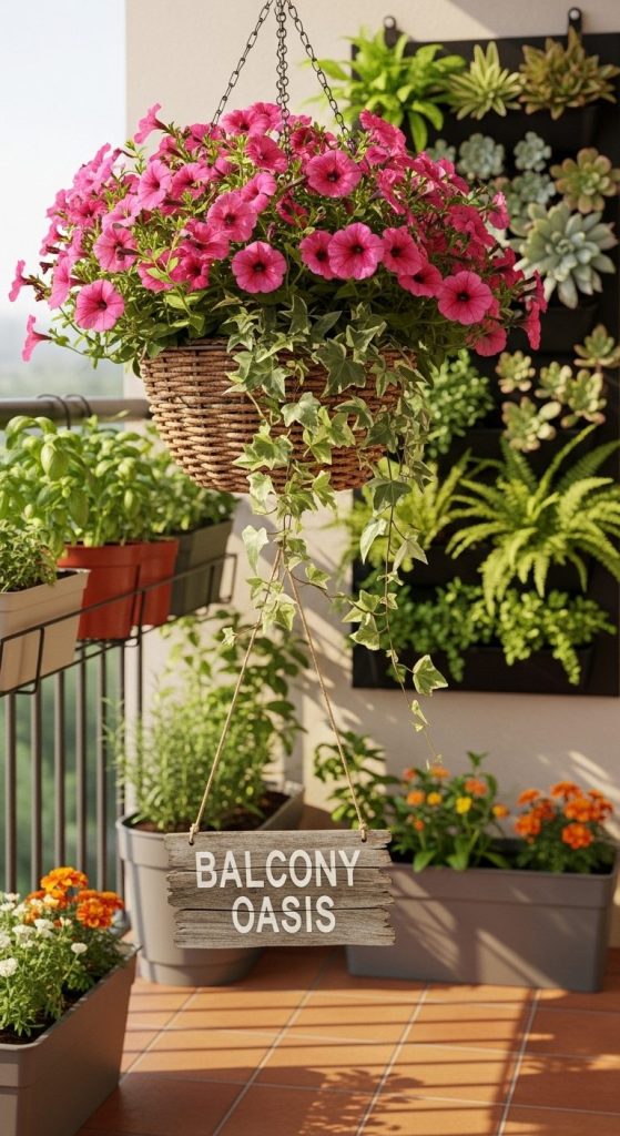 Pair your favorite hanging basket with a small attached sign. This works beautifully for small patios, balconies, or container gardens. A dangling plaque with a cheerful phrase instantly draws attention to your floral arrangement.
