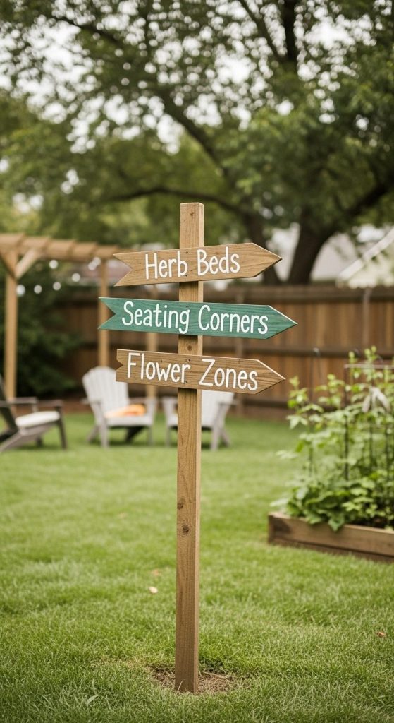 Ever wanted to add a sense of discovery to your garden? Directional arrow signs point visitors toward specific areas—herb patches, vegetable beds, or cozy seating corners. It’s playful and functional.