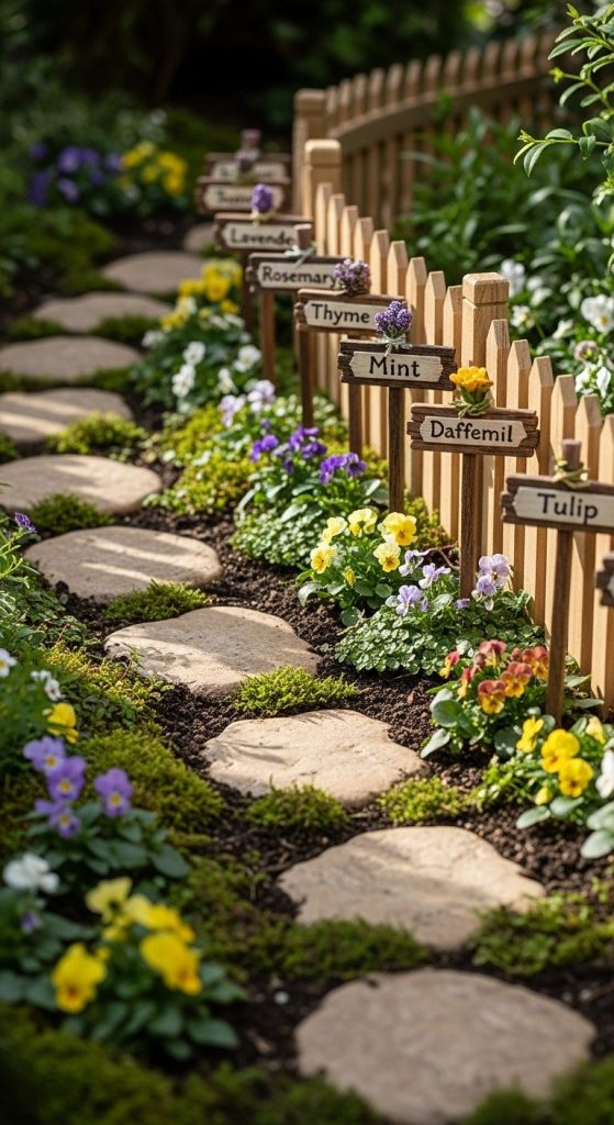 Installing small, fence-like signs along garden paths instantly adds structure. These are perfect for labeling herbs, flowers, or themed areas like “Fairy Garden” or “Secret Nook.”
