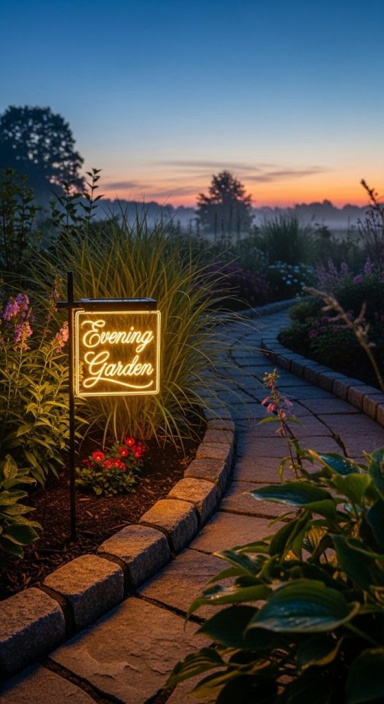 For those who love evening ambiance, solar-powered garden signs are functional and magical. They illuminate messages or garden names while doubling as gentle path lighting.