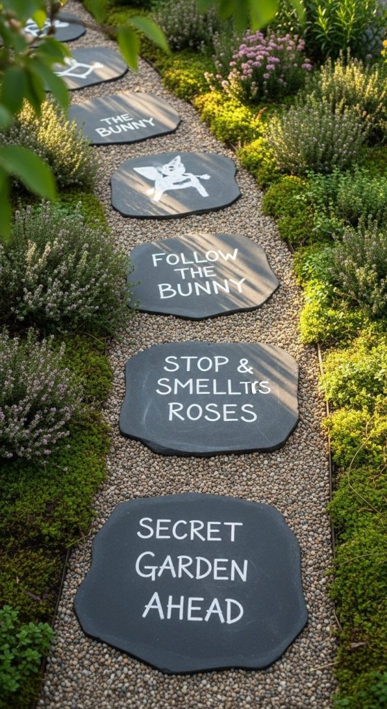 Combine functionality and signage with chalkboard stepping stones. Write temporary notes, plant names, or fun messages as part of your garden path. It’s playful, interactive, and visually charming.