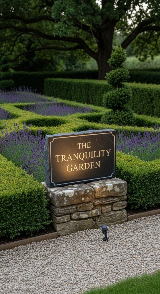 Engraved stone or slate signs convey permanence and elegance. Carve your garden’s name, a favorite quote, or plant labels into durable stone for a classic, long-lasting look.