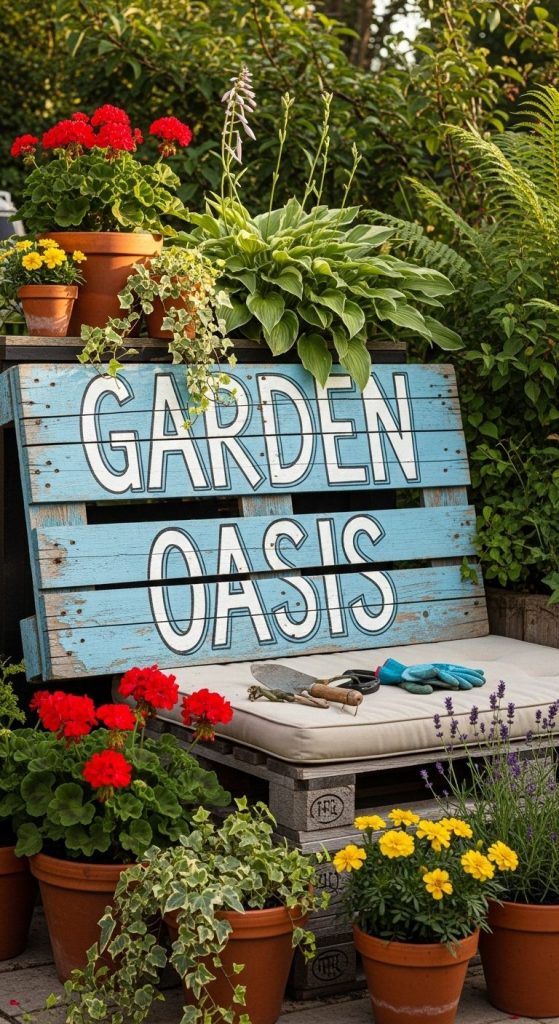 Recycled wooden pallets are versatile for making large, bold garden signs. Paint colorful messages or whimsical illustrations, then place them near seating areas, vegetable beds, or patios.