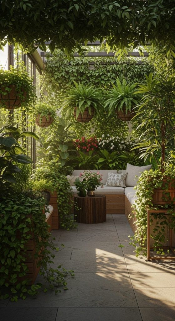 If your dream terrace feels like stepping into a secret garden, go all-in with greenery. Think potted palms, ferns, trailing vines, and bursts of color from flowering plants. The goal? Create a layered jungle that feels alive.