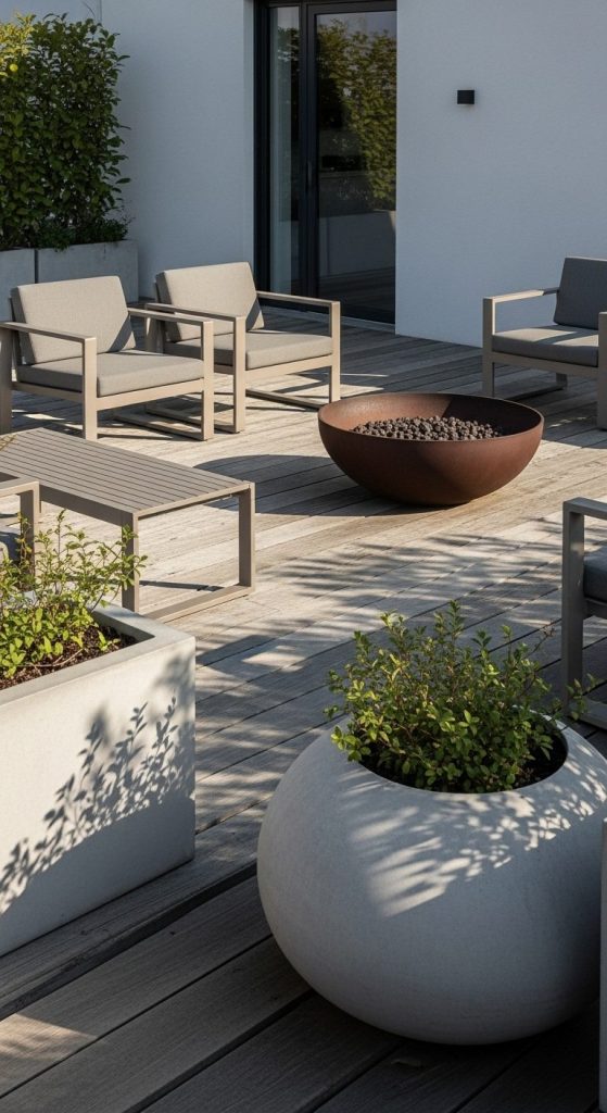 Takeaway: Minimal doesn’t mean boring. Add one focal point — like a sleek fire bowl or a statement chair — to anchor the space.