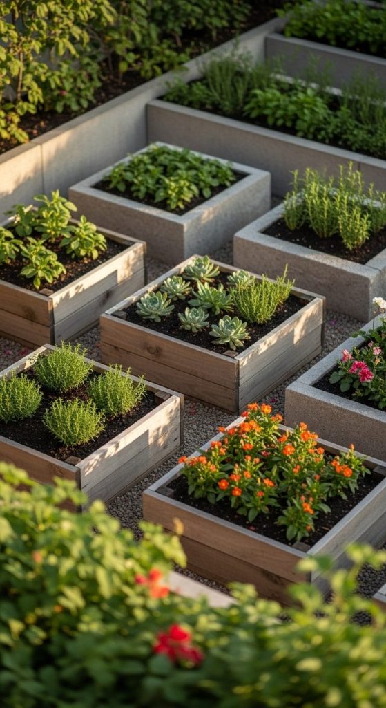 Takeaway: Raised planters = structure + charm. Mix materials like wood, stone, or metal for added texture.