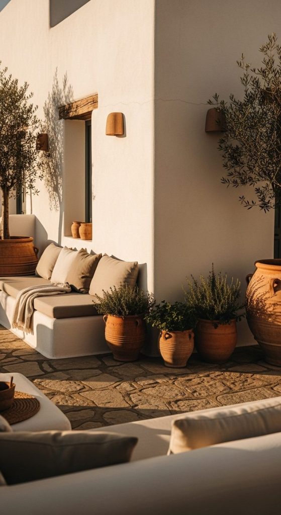 If your soul loves sunshine, olive tones, and rustic textures — go Mediterranean. Think white walls, terracotta pots, and olive-green cushions.