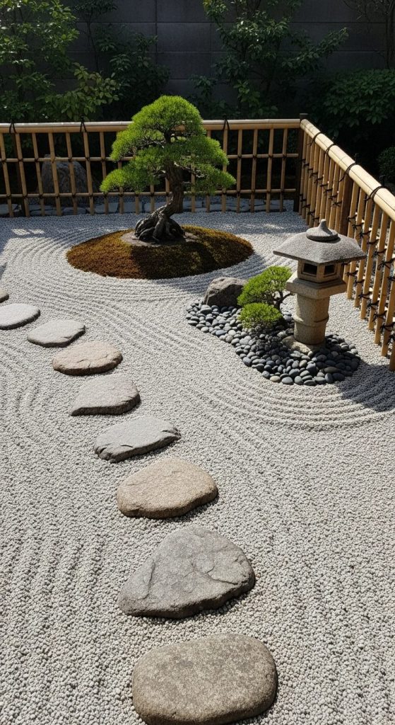 Minimalism meets mindfulness in this terrace idea. Raked gravel, bamboo, bonsai, and stone lanterns create peaceful harmony.