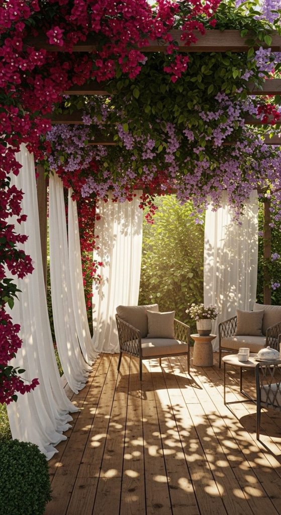A pergola can turn an exposed terrace into a shaded paradise. Add climbing plants or sheer curtains, and it’s instantly dreamy.