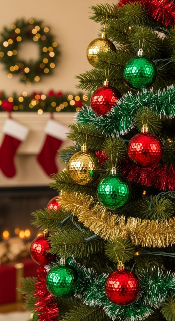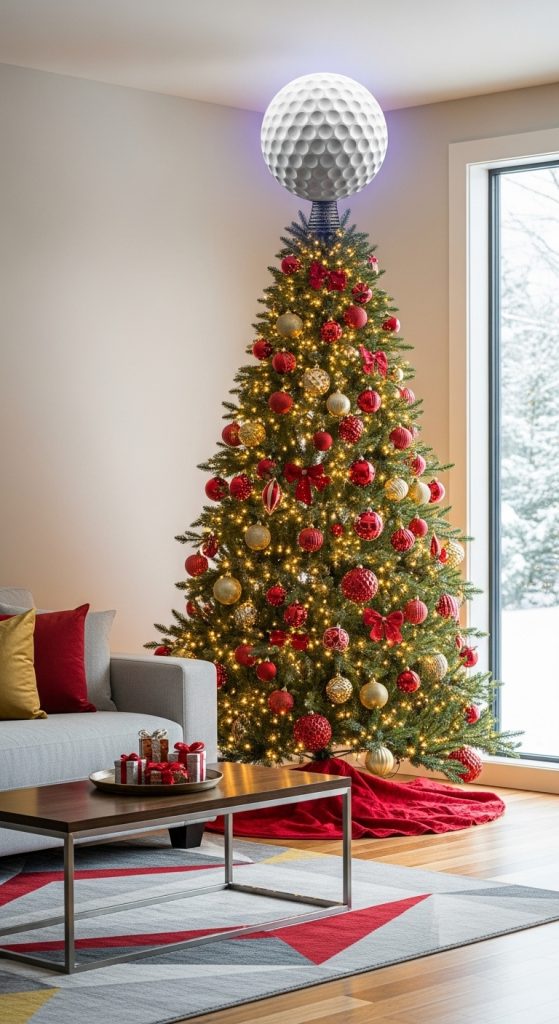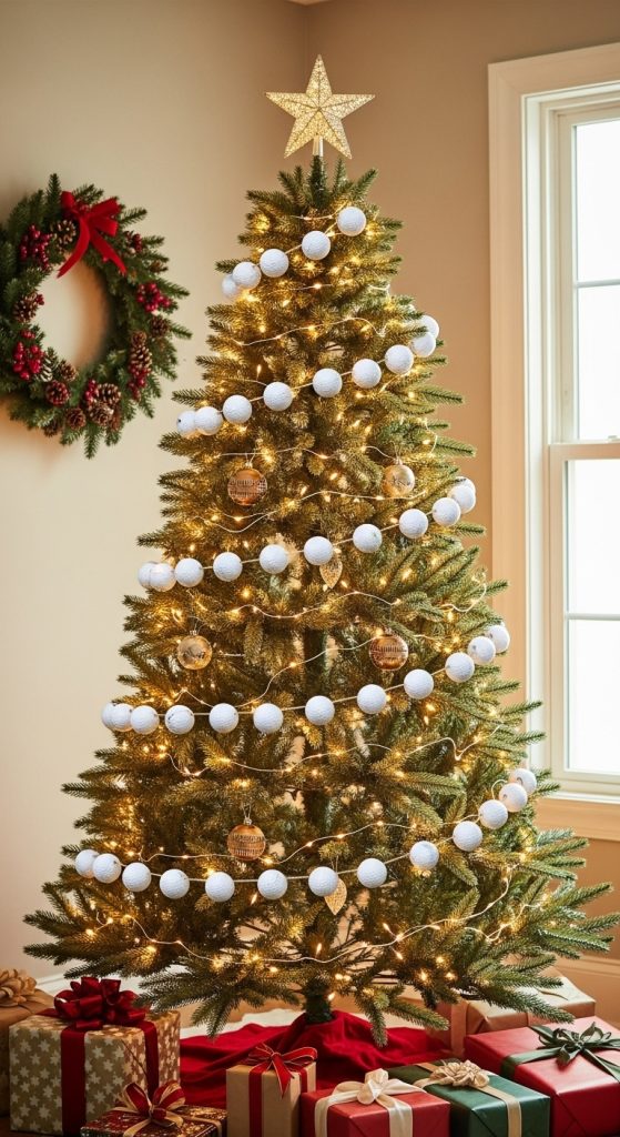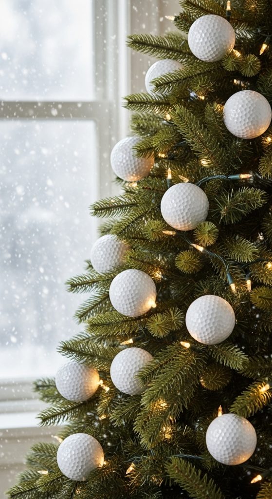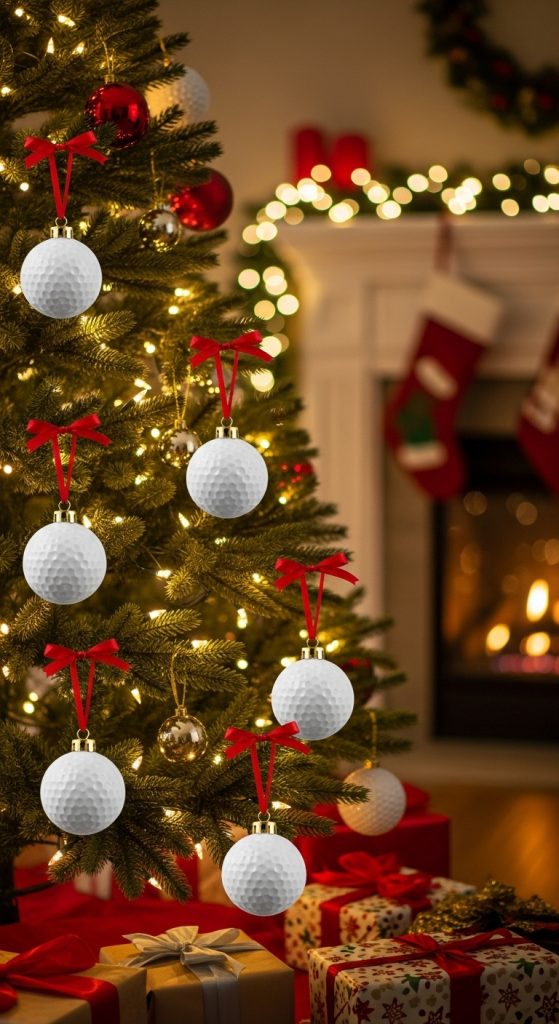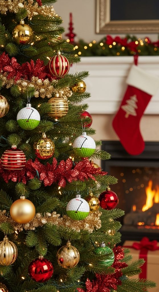 Mix traditional baubles with golf balls for a balanced look. Maybe half of your ornaments are sparkly red, half are golf-themed.